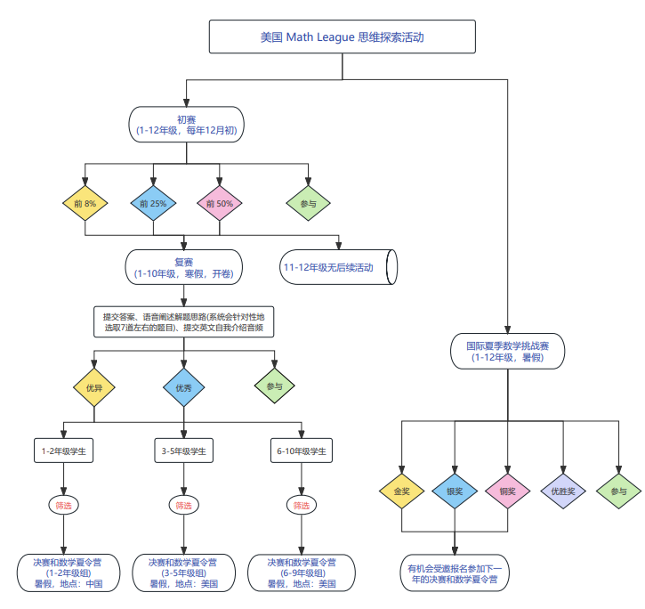 美国 Math League 思维探索活动分为初赛(1-12年级)、复赛(1-10年级)、决赛和数学夏令营(1-10年级)、和国际夏季数学挑战活动(1-12年级)。