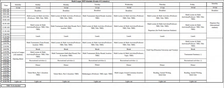 2025年美国Math League 决赛和数学夏令营由美国 Math League组委会和普林斯顿大学数学系 (Princeton University Mathematics Department) 、哥伦比亚大学数学系(Columbia University Mathematics Department)、威廉姆斯学院 (Williams College) 联合举办,地点在美国新泽西州。
