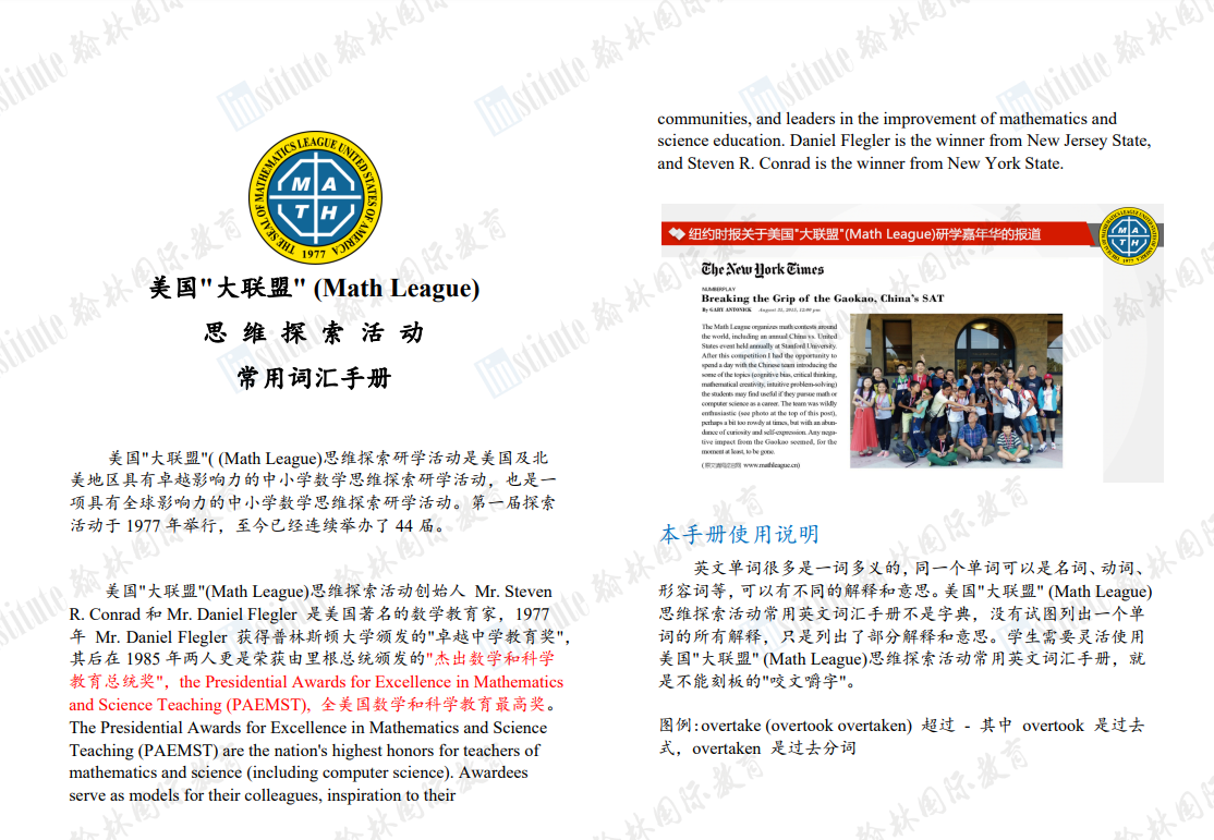 "美国的中小学教育并不像传说中的那么简单,美国有世界一流的大学,众多诺贝尔奖、菲尔茨奖(数学最高奖)获得者,以及众多科技及人文的创新。" 让我们通过参加美国Math League第二阶段活动来探索其中的奥秘吧。"教育不是把脑袋装满,而是让思维飞跃。"