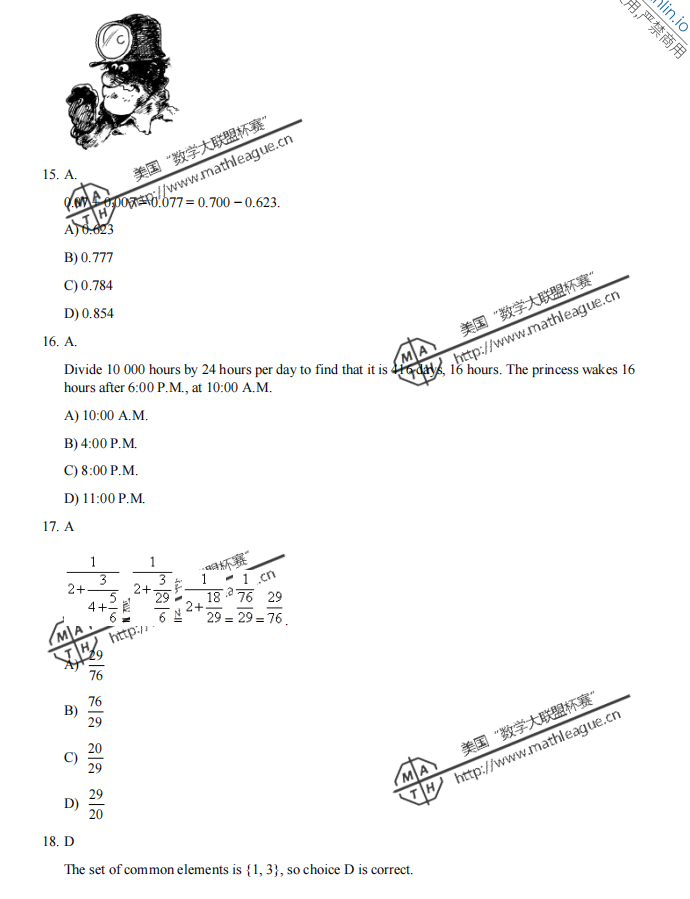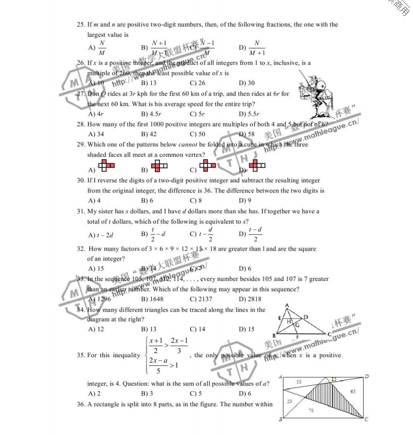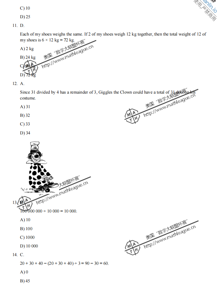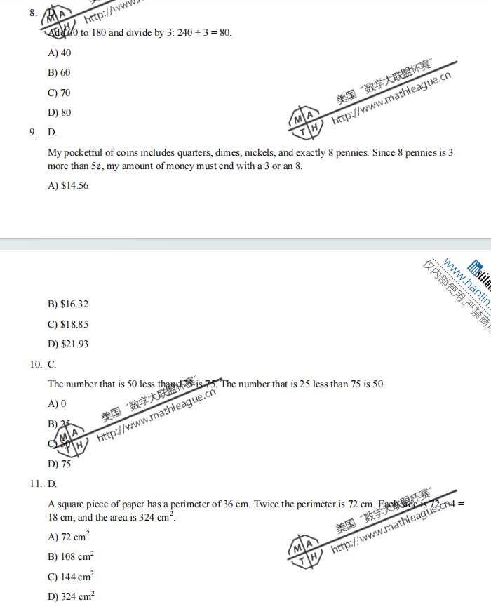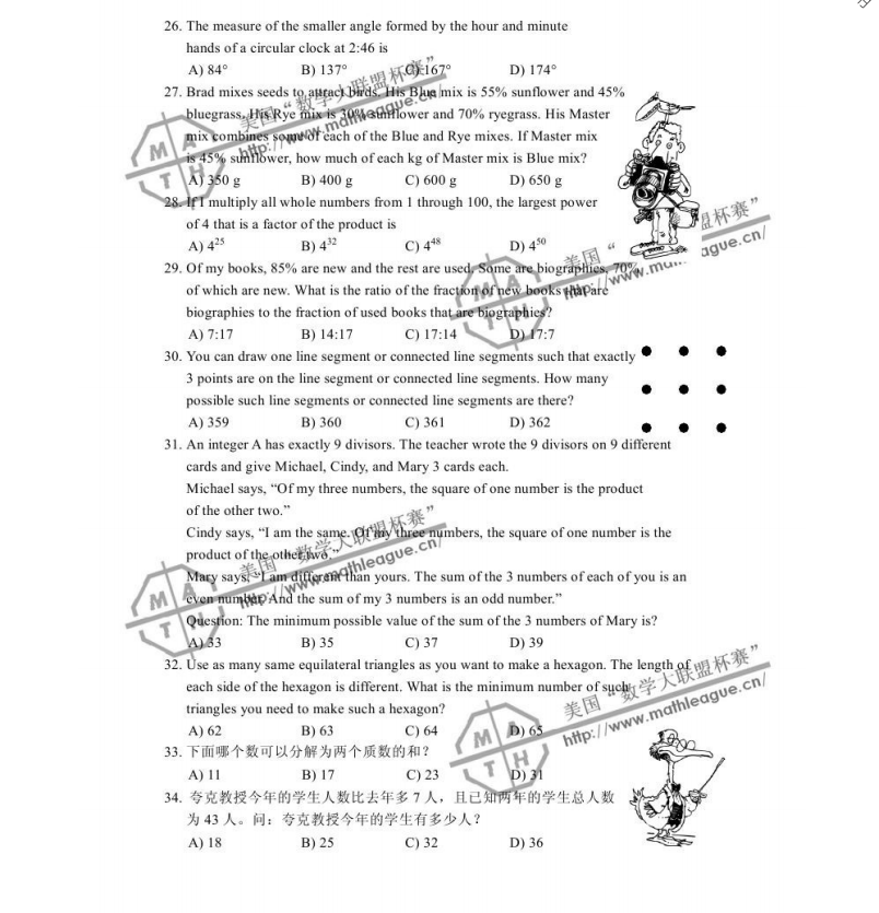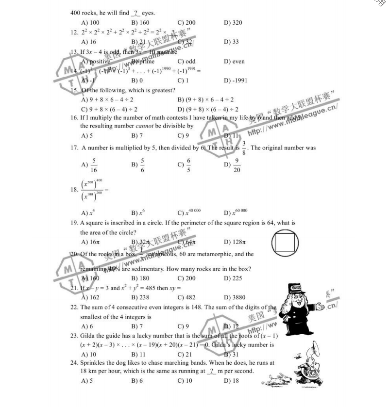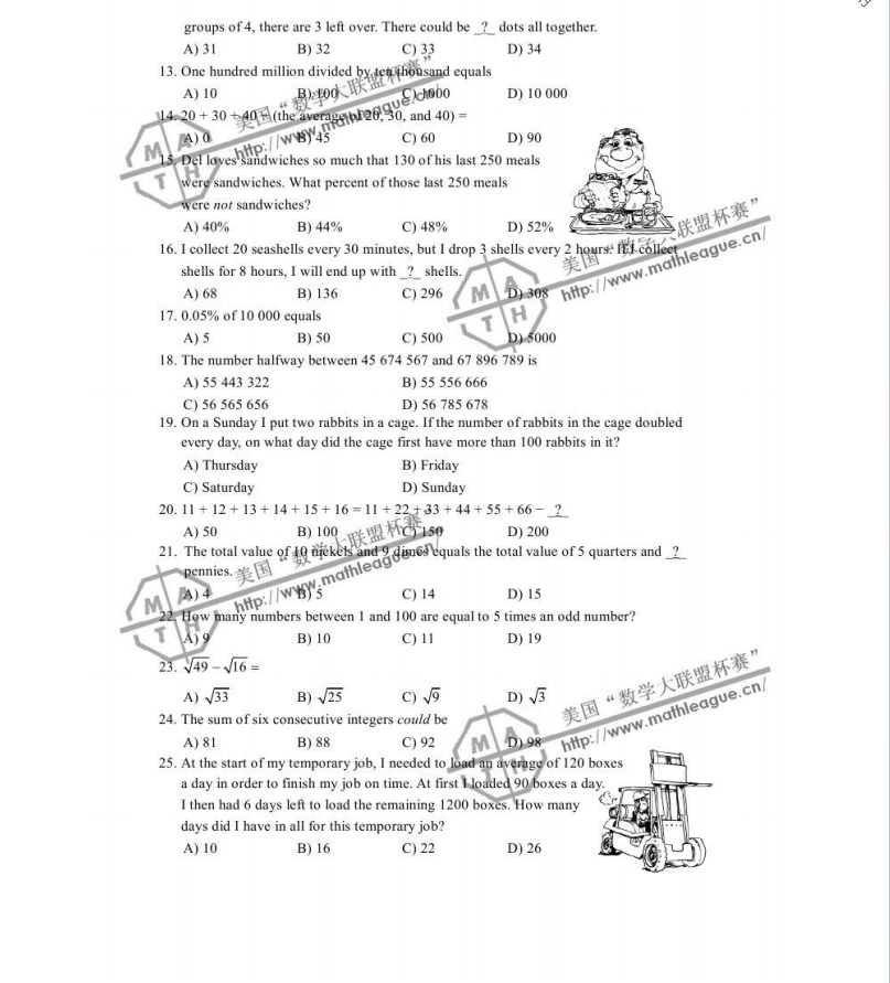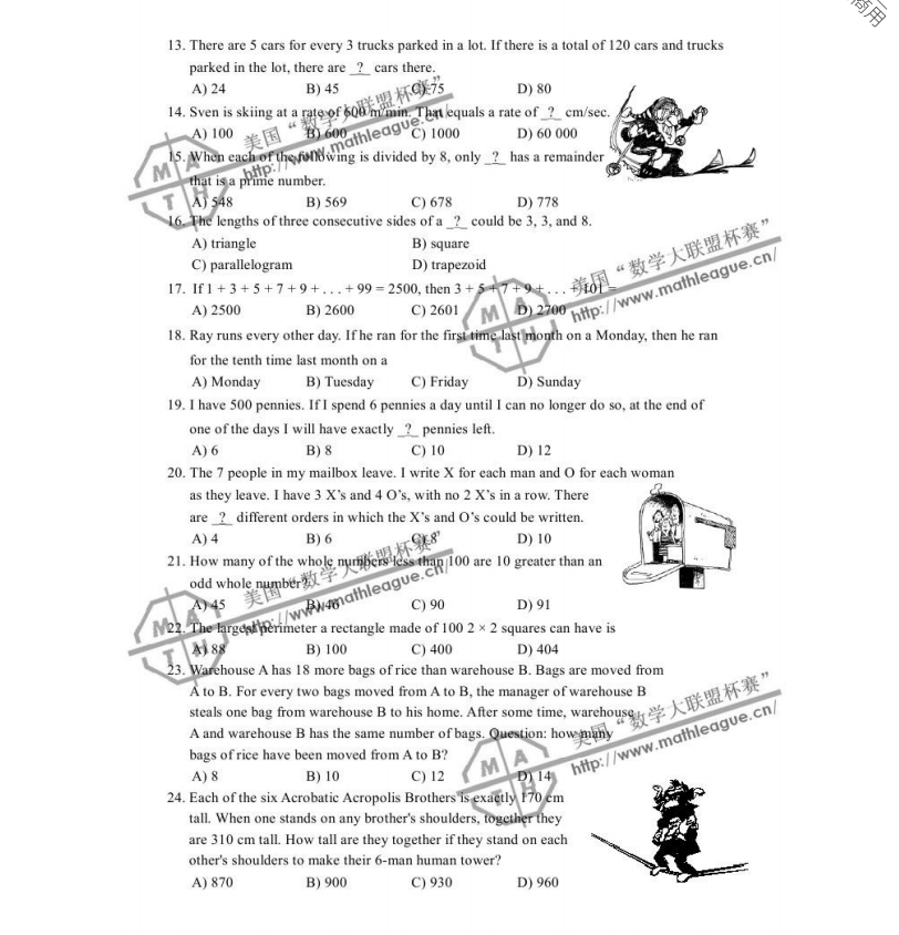 美国数学大联盟竞赛的题目设计灵活生动、贴近生活,不仅测试学生的数学知识,更注重培养他们对数学的兴趣和解决实际问题的能力。近年来,竞赛题目中图片和图表信息的增加也值得注意,这要求考生具备从图形中快速提取信息的能力。