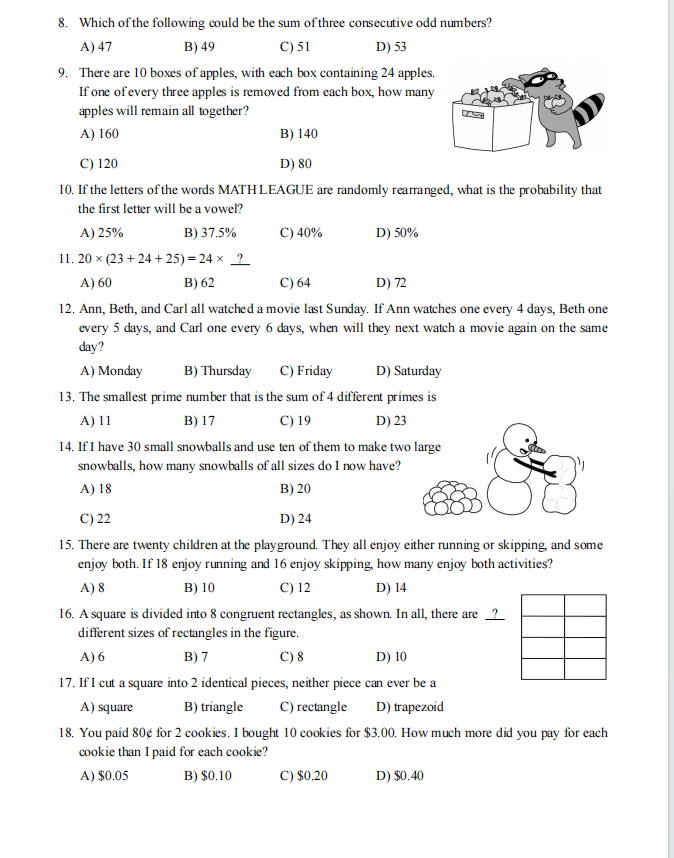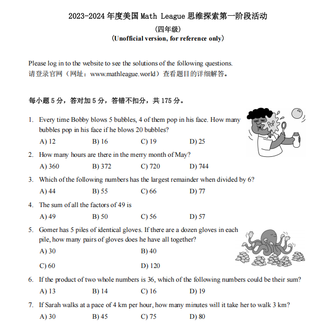 2023-2024 美国MathLeague 初赛四年级真题+答案在线看!来试做一下 真题在线做! 答案在线看! (篇幅有限,仅展示部分) 扫码即可免费下载完整真题+答案解析⇓ 还可以免费下载 Math League历年初赛/复赛/决赛/夏季挑战赛真题&答案等资料⇓