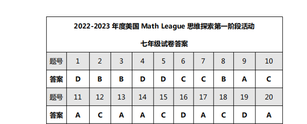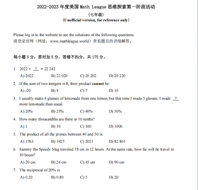 2022-2023 美国MathLeague 初赛七年级真题+答案在线看!来试做一下 真题在线做! 答案在线看! (篇幅有限,仅展示部分) 扫码即可免费下载完整版真题+答案解析⇓ 还可以免费下载 Math League历年初赛/复赛/决赛/夏季挑战赛真题&答案等资料⇓