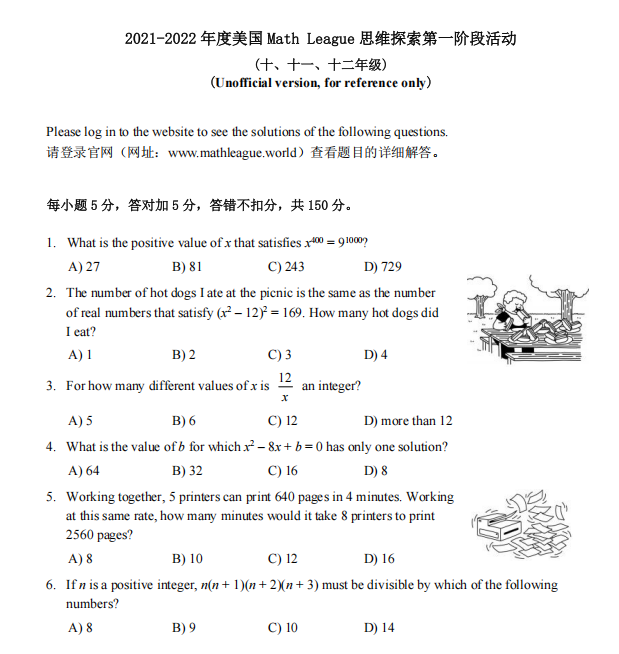 2021-2022 美国MathLeague 初赛10、11、12年级真题+答案在线看!来试做一下 真题在线做! 答案在线看! (篇幅有限,仅展示部分) 扫码即可免费下载完整版真题+答案解析⇓ 还可以免费下载 Math League历年初赛/复赛/决赛/夏季挑战赛真题&答案等资料⇓