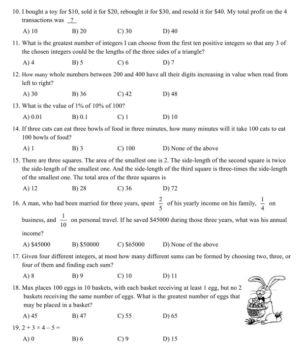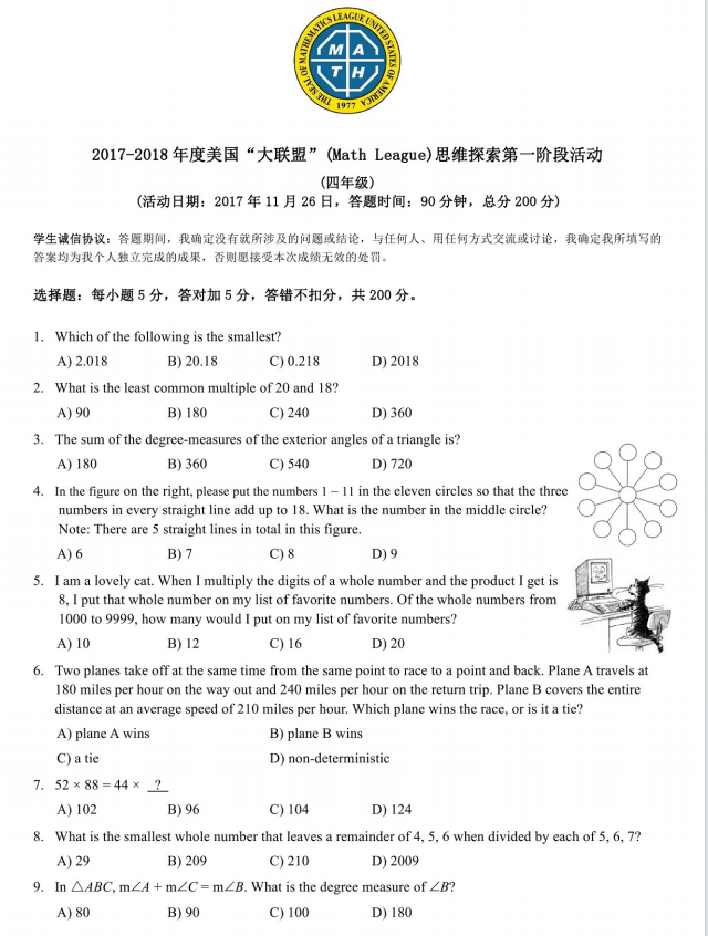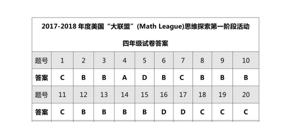 2017-2018 美国MathLeague 初赛四年级真题+答案在线看!来试做一下 真题在线做! 答案在线看! (篇幅有限,仅展示部分) 扫码即可免费下载完整版真题+答案解析⇓ 还可以免费下载 Math League历年初赛/复赛/决赛/夏季挑战赛真题&答案等资料⇓