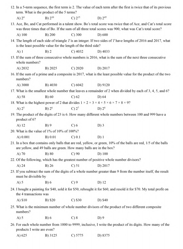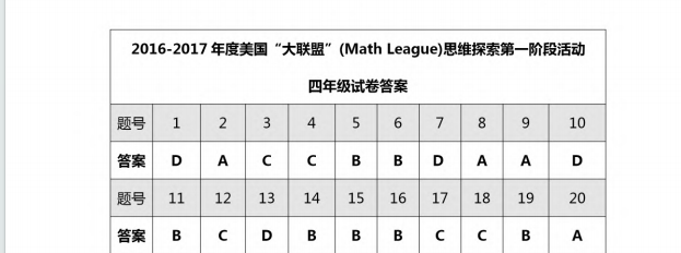 2016-2017 美国MathLeague 初赛四年级真题+答案在线看!来试做一下 真题在线做! 答案在线看! (篇幅有限,仅展示部分) 扫码即可免费下载完整版真题+答案解析⇓ 还可以免费下载 Math League历年初赛/复赛/决赛/夏季挑战赛真题&答案等资料⇓