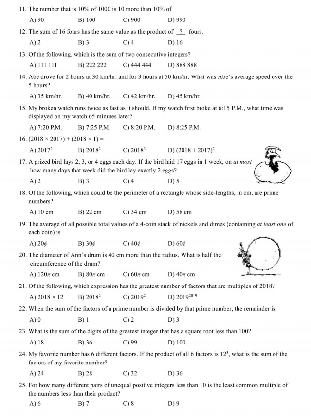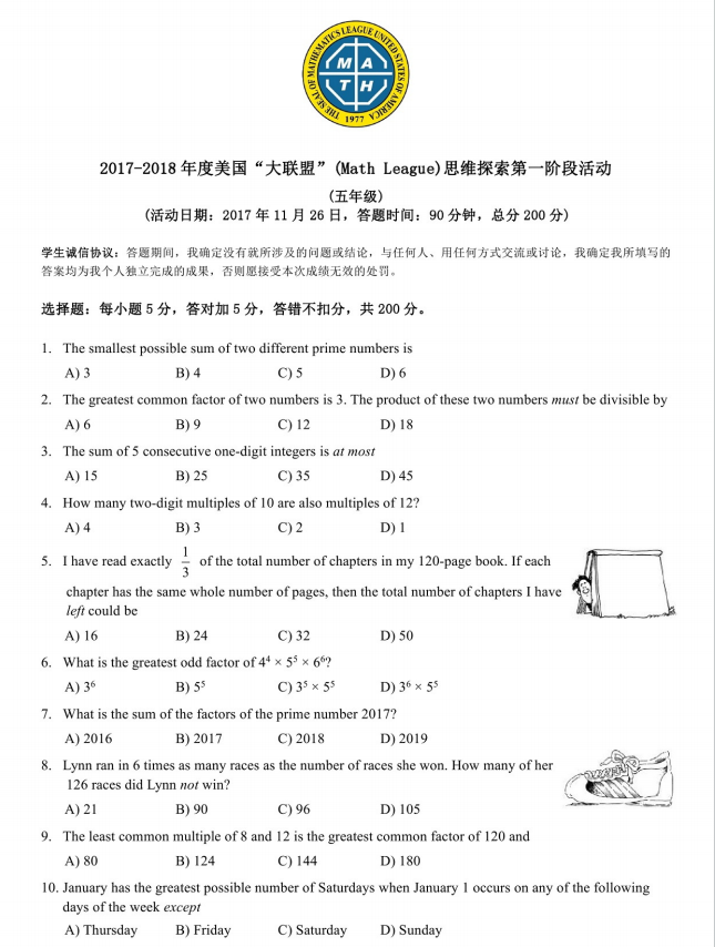 2017-2018 美国MathLeague 初赛五年级真题+答案在线看!来试做一下 真题在线做! 答案在线看! (篇幅有限,仅展示部分) 扫码即可免费下载完整版真题+答案解析⇓ 还可以免费下载 Math League历年初赛/复赛/决赛/夏季挑战赛真题&答案等资料⇓