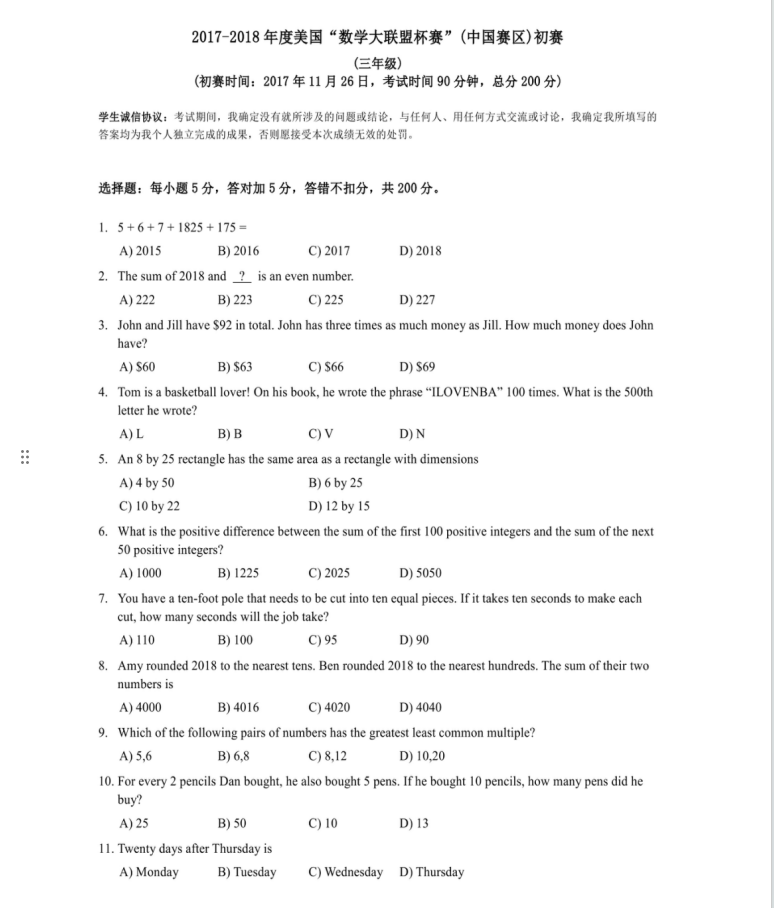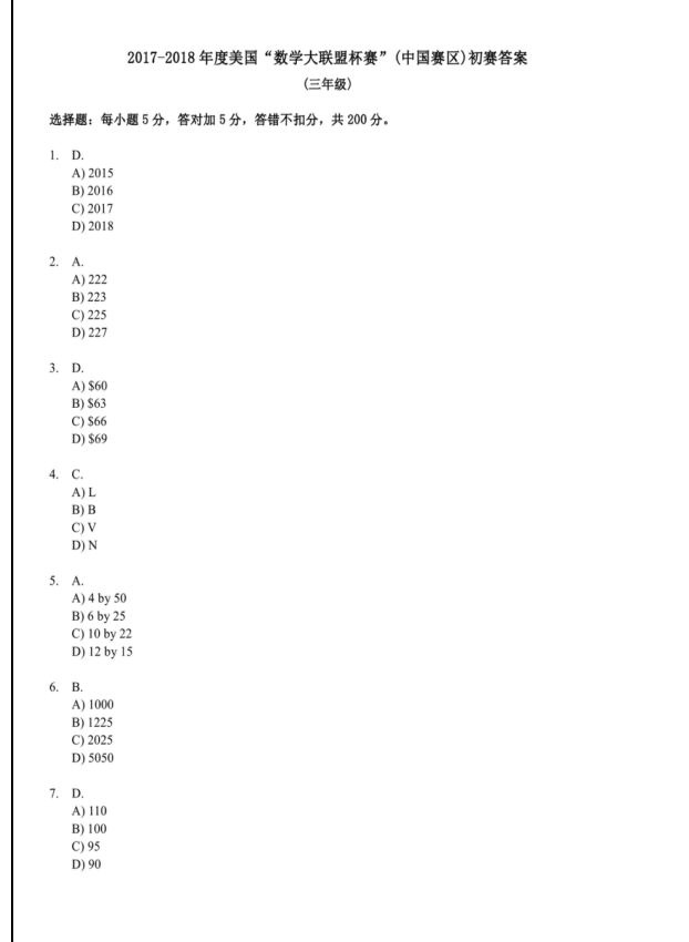 2017-2018 美国MathLeague 初赛三年级真题+答案在线看!来试做一下