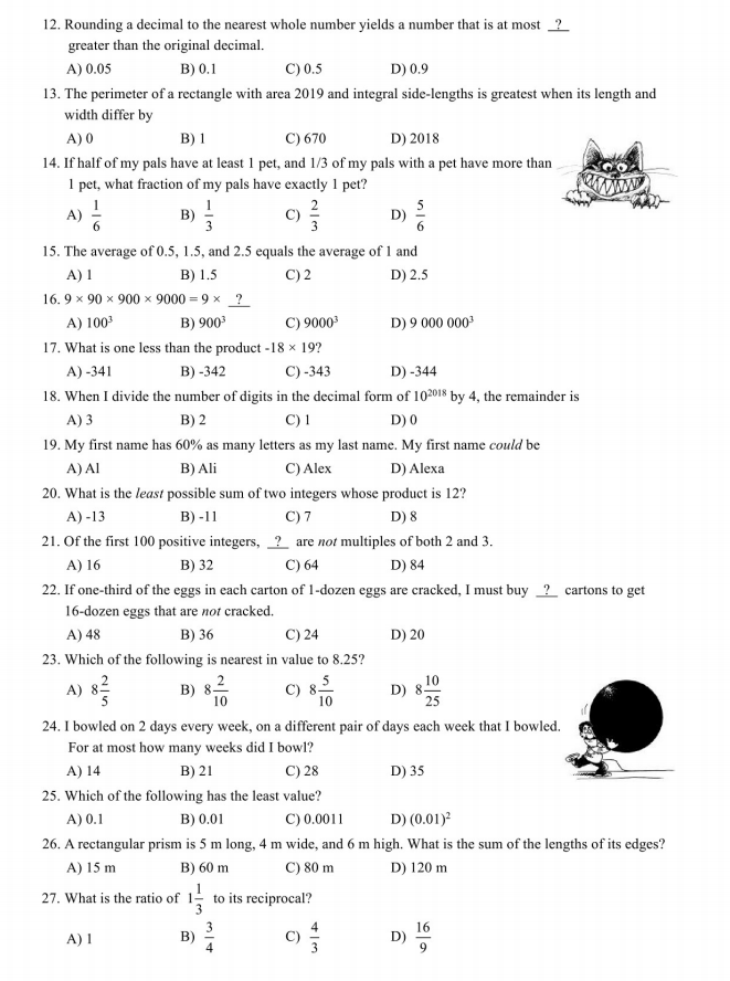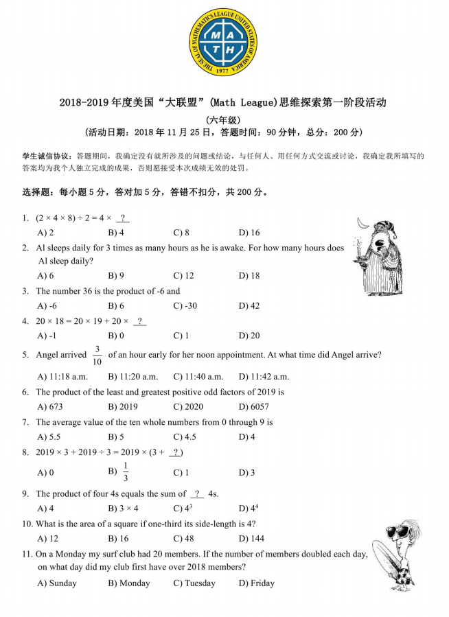 2018-2019 美国MathLeague 初赛六年级真题+答案在线看!来试做一下
