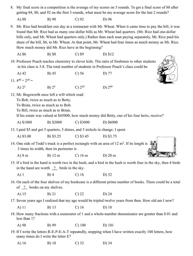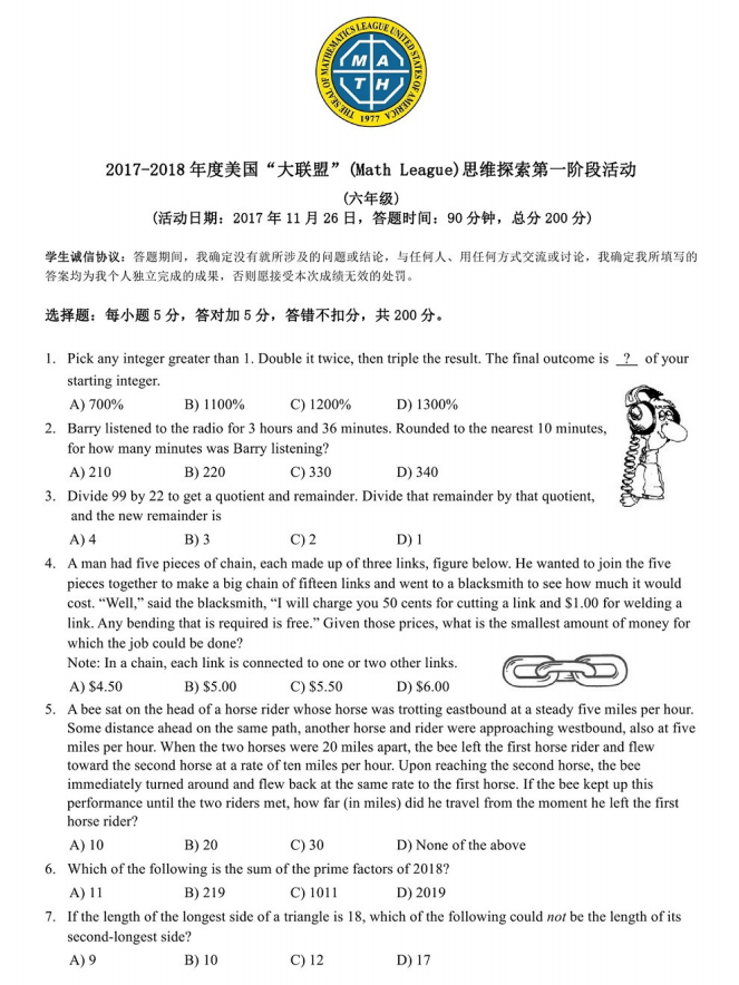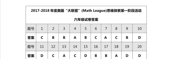 2017-2018 美国MathLeague 初赛六年级真题+答案在线看!来试做一下 真题在线做! 答案在线看! (篇幅有限,仅展示部分) 扫码即可免费下载完整版真题+答案解析⇓ 还可以免费下载 Math League历年初赛/复赛/决赛/夏季挑战赛真题&答案等资料⇓