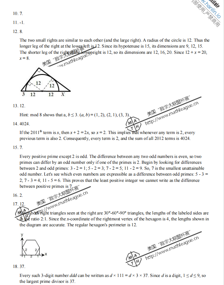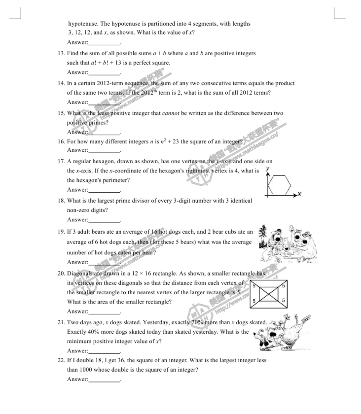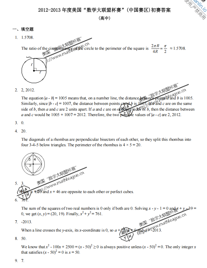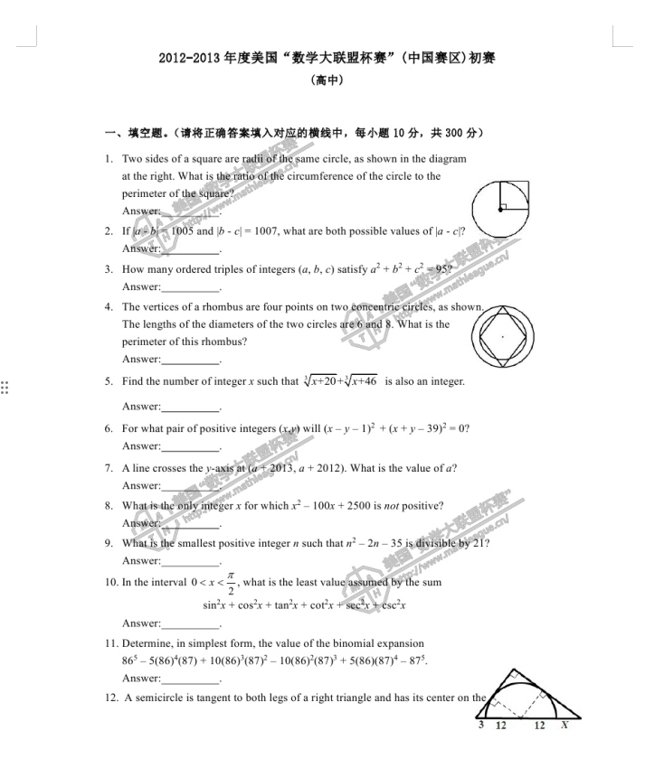 2012-2013 年度美国“数学大联盟杯赛”(中国赛区)初赛真题及答案 (高中) 1、真题 2、答案 (*篇幅有限,仅展示部分) 扫码即可免费下载完整版真题+答案解析⇓ 还可以免费下载 Math League近十年初赛/复赛/决赛/夏季挑战赛真题&答案等资料⇓