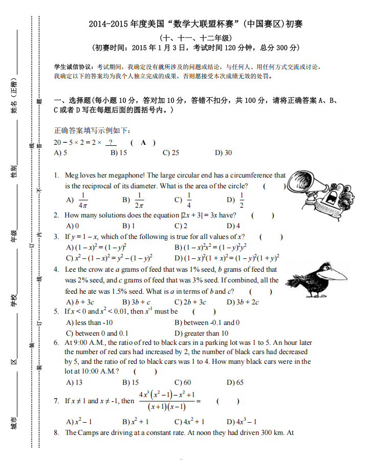 2014-2015 年度美国“数学大联盟杯赛”(中国赛区)初赛真题及答案 (十、十一、十二年级) 1、真题 2、答案 (*篇幅有限,仅展示部分) 扫码即可免费下载完整版真题+答案解析⇓ 还可以免费下载 Math League近十年初赛/复赛/决赛/夏季挑战赛真题&答案等资料⇓