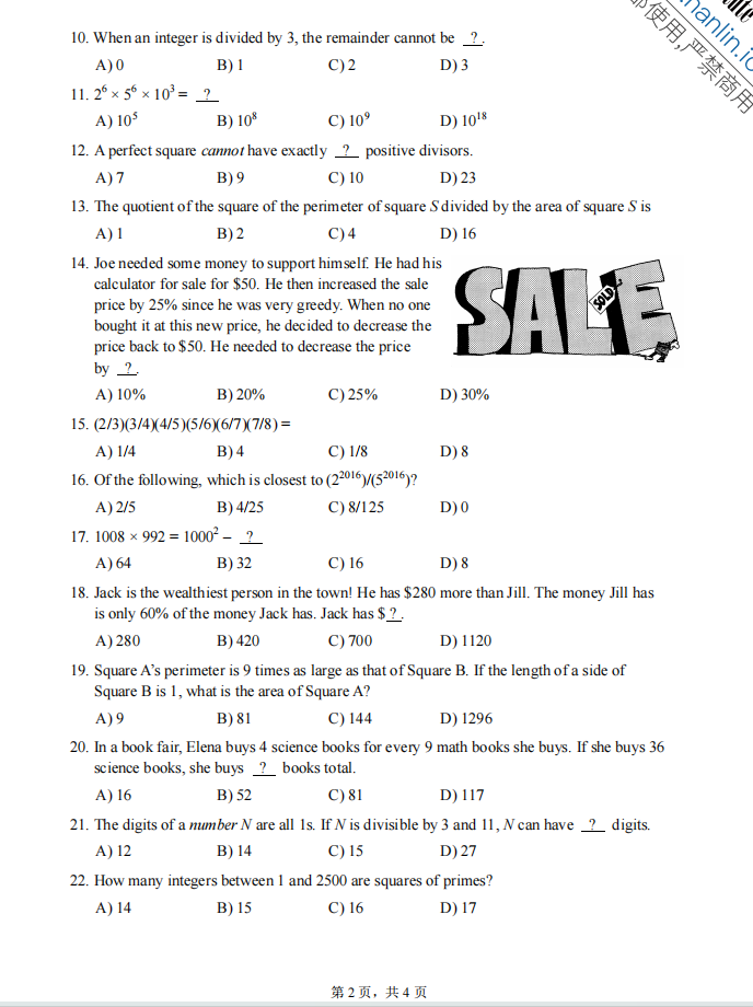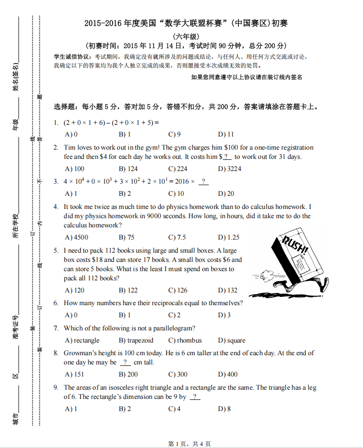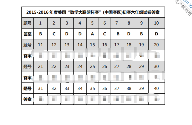 2015-2016 年度美国“数学大联盟杯赛”(中国赛区)初赛真题及答案 (六年级) 1、真题 2、答案 (*篇幅有限,仅展示部分) 扫码即可免费下载完整版真题+答案解析⇓ 还可以免费下载 Math League近十年初赛/复赛/决赛/夏季挑战赛真题&答案等资料⇓