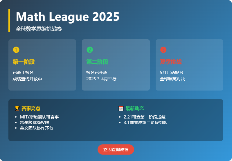 通过系统备赛与策略规划,学生可在Math League赛事中充分展现数学潜能,为升学与学术发展积累核心优势。